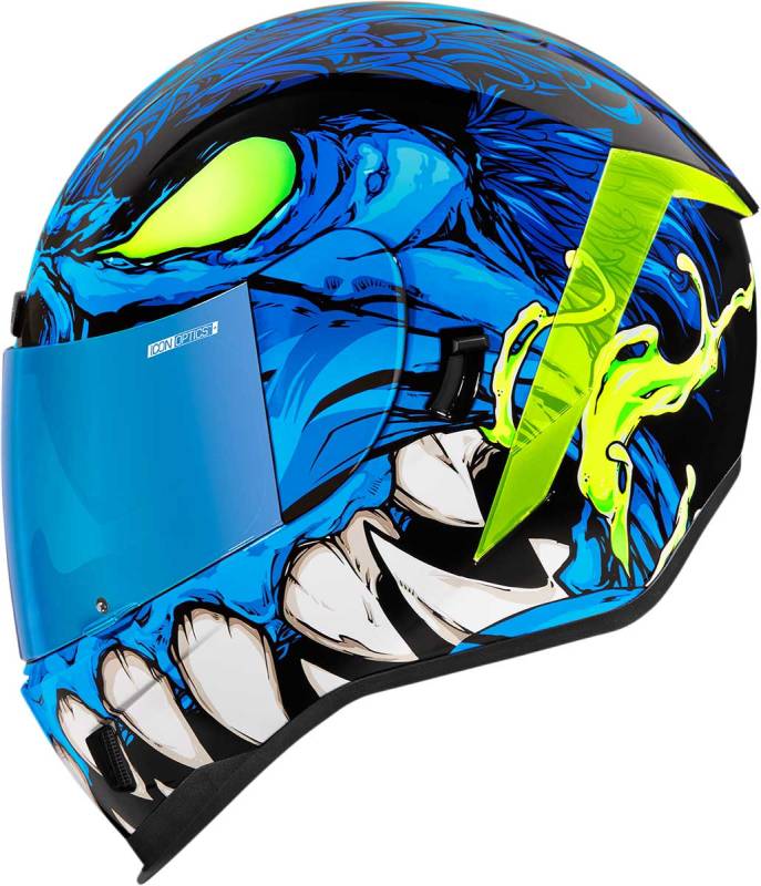 From the undisputed king of toothy tooth-laden helmets comes a throwback to one of our first evil grins, the Airform Manikr. First launched on a Mainframe helmet, this version features a strong polycarbonate shell, removable Hydradry comfort liner, both Fog-Free Clear & color-matched RST shields, and Dark Smoke internal DropShield. The exterior boasts glow-in-the-dark slobber, dayglo green spoilers, and a completely different spelling courtesy of our helmet designer. If you loved the original Manic, youre going to super love the Airform Manikr.