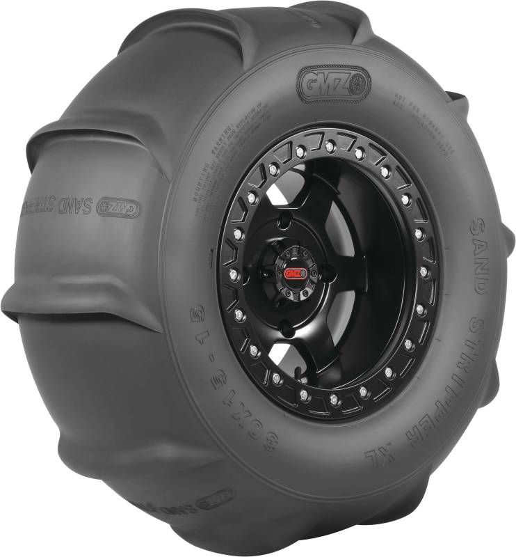 GMZ Race Products Sand Stripper and Sand Stripper TT Tires feature an extra wide footprint that provides maximum flotation and smooth dune transitions. Thick rim guard material keeps sand out of the bead while protecting wheel lip and the tough bias construction delivers long lasting durability. Front tires are available in the original Sand Stripper design with concaved tread ribs for responsive steering or the TT design that combines concaved tread ribs with a lateral traction block, maximizing the all-wheel drive power to climb steep hills faster. Rear tires are available in deep cut models designed for naturally aspirated machines, delivering extreme acceleration or staggered paddle models for smaller performance machines.