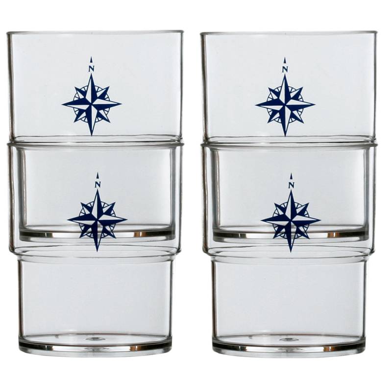 The NORTHWIND set of stackable glasses, made of polycarbonate, is composed of a total of 12 stackable glasses decorated with an elegant yet simple compass rose. This article is essential for aperitifs on board.