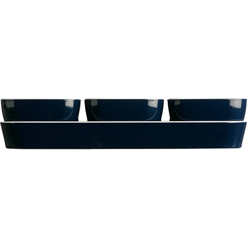 The practical REGATA snacks set contains 4 pieces (a tray and three bowls) made from two-tone blue and white unbreakable melamine.