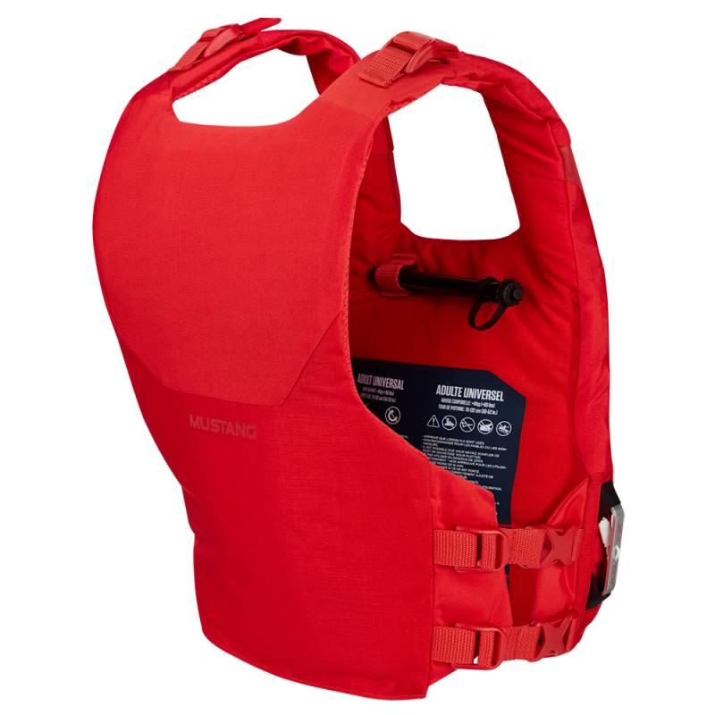 Mustang's Revolutionary dual flotation PFD. This vest inflates! It gives just enough foam to help you float and swim easily, plus it can easily be inflated to boost buoyancy with a quick pull of the manual handle when you really need it.