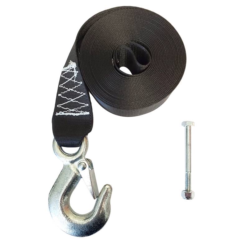 20' replacement winch strap constructed of 7.000 lb. polyester belt and 6,600 lb. drop forged snap hook. Includes a bolt and nylon lock nut for drum installation.