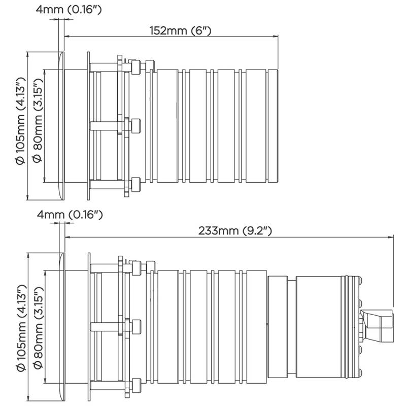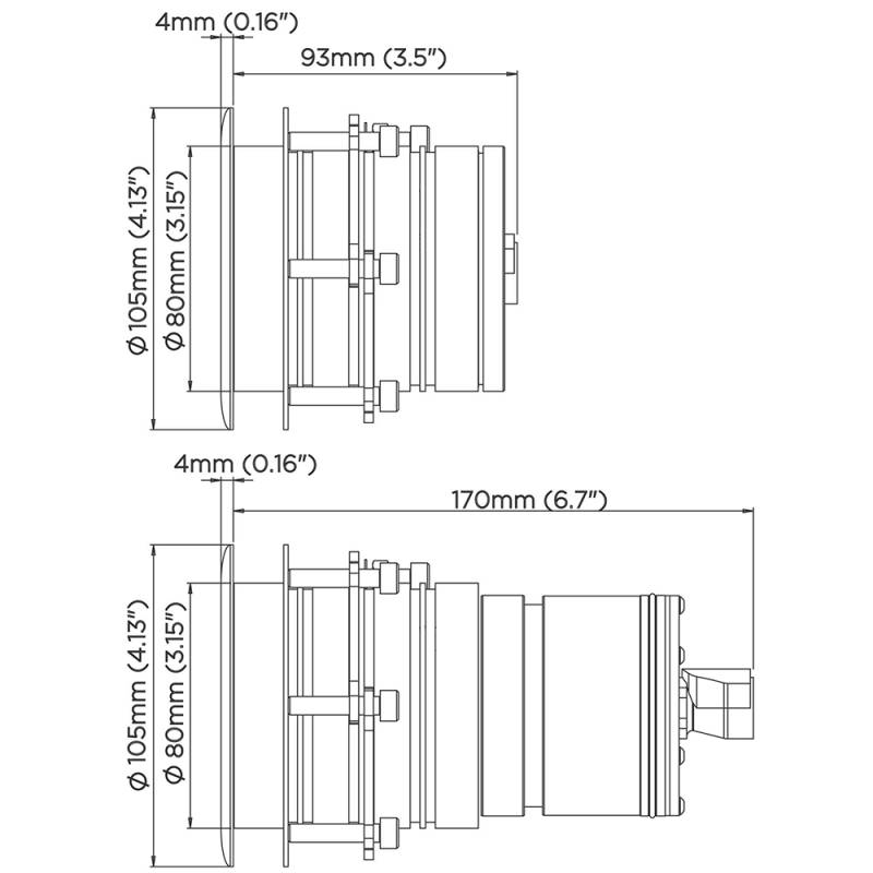 The ultra low profile outer face of the housing is designed for vessels wanting to go fast and have no impact on the speed or flow of water over the hull, perfect for the sides or running surfaces.
