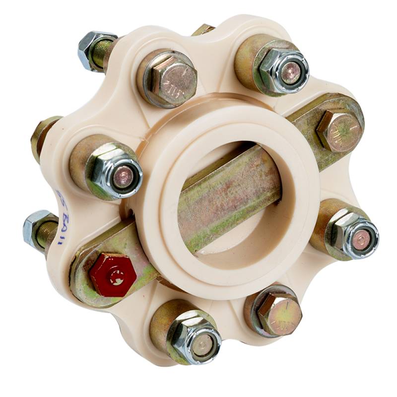 The flexible disc is machined from a resilient and durable polyurethane. It allows the unit to flex, absorbing vibrations and temporary misalignment of the shaft and engine due to movement of the engine or flexing in the =vessel's structure.