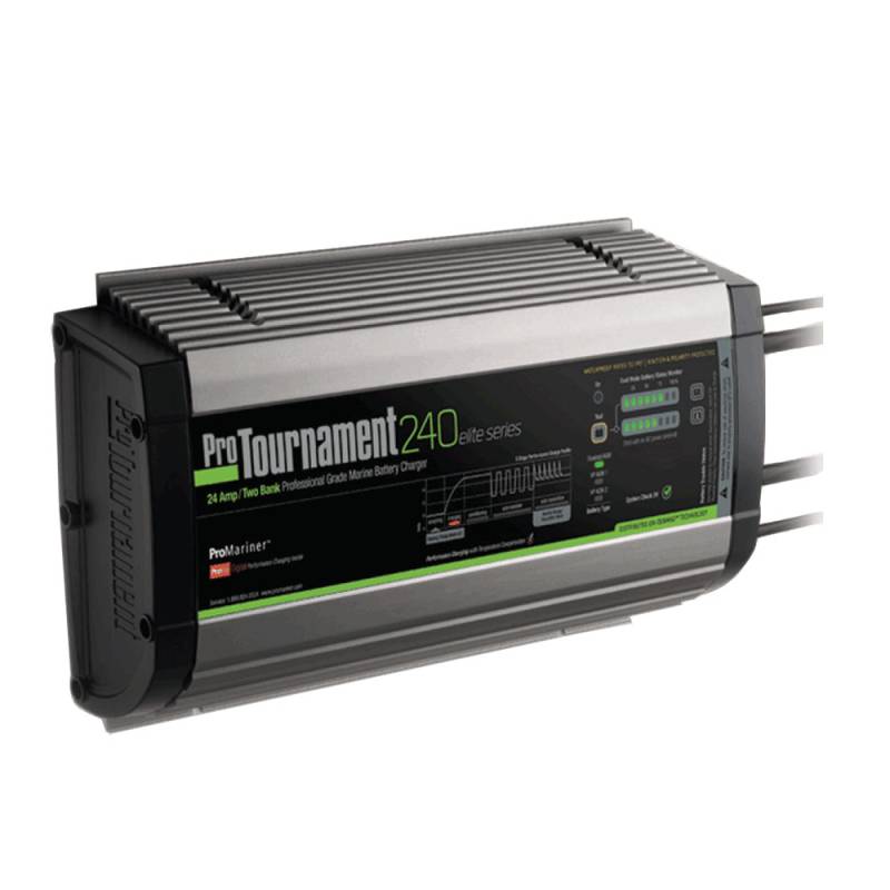 ProTournament 240 elite Dual Charger - 24 Amp, 2 BankTournament Winning TechnologyThe fastest battery charger with the most features in its class. Specifically designed to deliver maximum charging performance and extend battery life. Get on the water first and stay there longer with tournament winning technology providing: 100% charge upon completion of multi-stage charging process. 100% charging output with AC power as low as 90 VAC. 50% lighter and 2 to 3 times faster than traditional chargers. Give your batteries what they demand with ProTournament