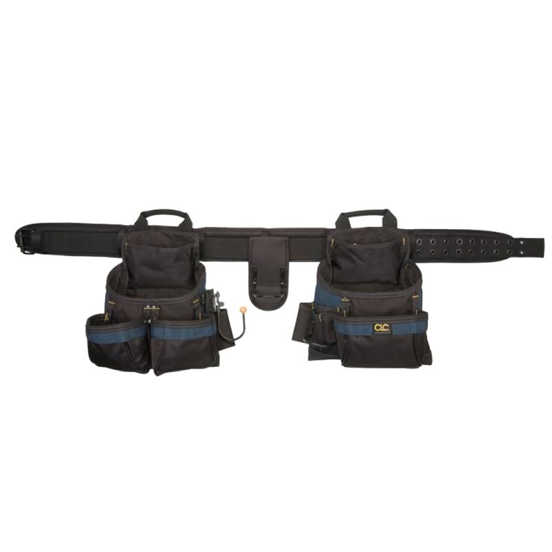 A professional quality 4-piece framer's combo tool belt in ballistic poly fabric with a 3" padded, double-tongue roller buckle belt, cordless drill hook, and 17 pockets to hold your favorite nails and tools.