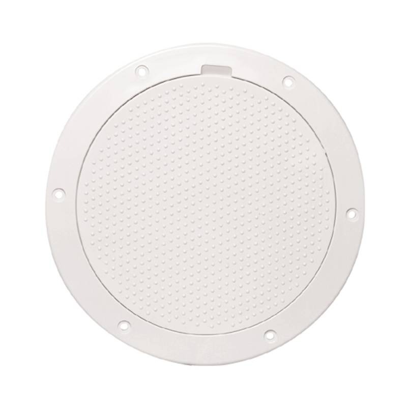 Pry-Out Deck PlatesBeckson developed the first pry-out deck plate. These plates were designed with an extra heavy O-ring to assure a water tight fit. Plates are provided with non-skid or smooth surfaces for different installation requirements. The original was used to access the handle for Beckson's permanently mounted pump. The Beckson Diamond Pattern deck plate extends across the center, eliminating a ring around the edge that traps dirt and debris. Pry-out plates should be installed in areas where internal pressure (oil-canning) is not present.