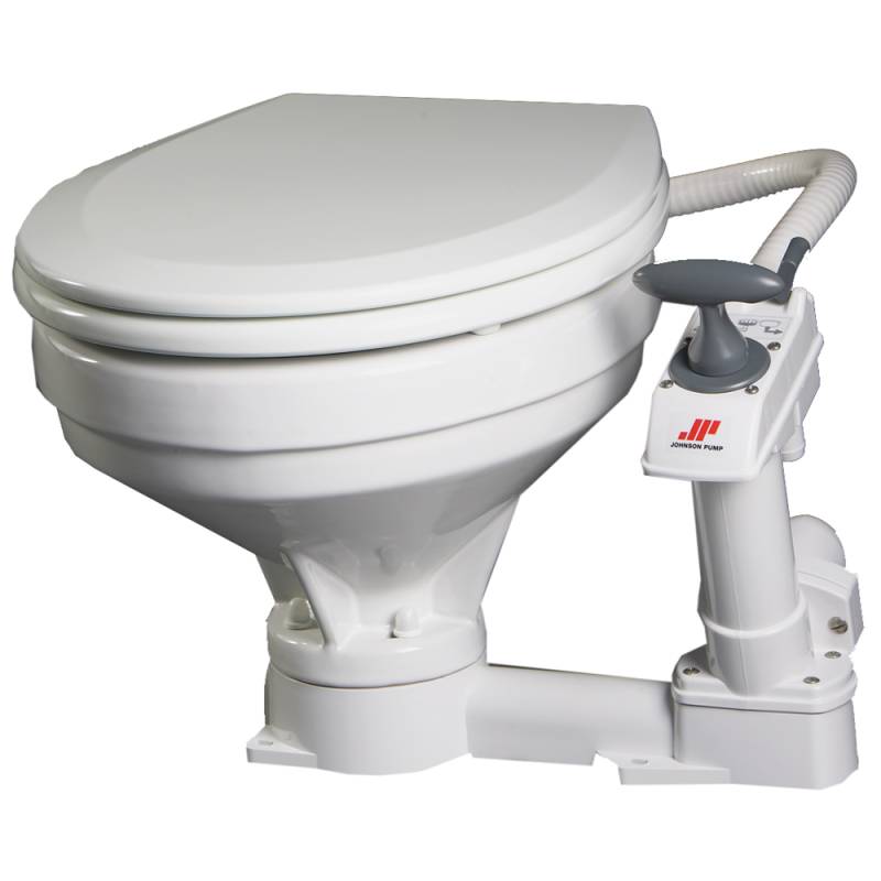 AquaT Marine Manual ToiletThe fine finish and well thought-through design of these toilets is remarkable. Made from white vitreous porcelain, and with corrosion resistant parts throughout, the Johnson Pump AquaT marine toilet, is quiet, robust and easy to clean.The AquaT toilet will give you years of trouble free operation. The manual version incorporates an ergonomically designed, hand-powered piston pump that can be mounted for either left-hand or right-hand use. When spare parts such as a new seat or valve are needed, you'll find Johnson Pump's global network of distributors at your service.