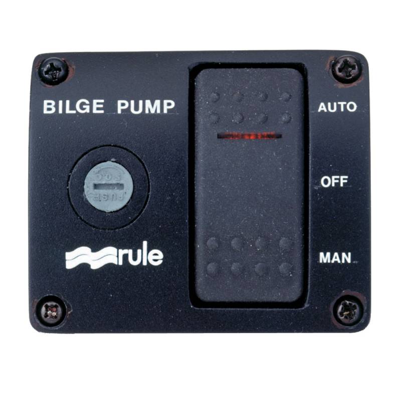 3-Way Lighted Rocker Panel SwitchControls any pump equipped with an automatic float switch. This unit features a black plastic panel. It has a built-in fuse holder and an internally lighted rocker switch with 3 positions (automatic, off, or manual) with the Rule "fail-safe" spring return to "off" from the "manual" position.