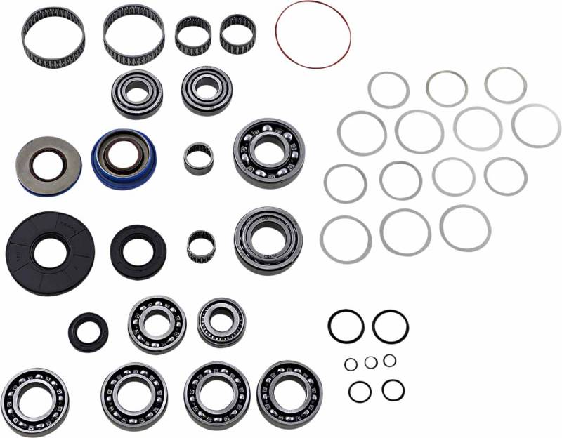 Kit contains all of the bearings, seals, O-rings and shims as required to rebuild the transmission