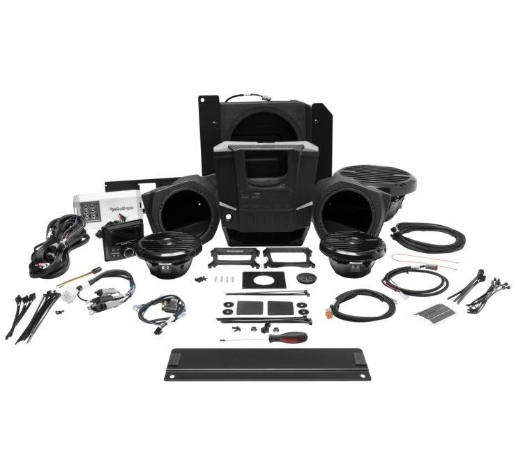Can Am Steage 3 includes a punch compact receiver with 2.7in. color display, dash instal kit, one pair of Prime 6.5in. full range front speakers with enclosures, Prime 10in. 2-ohm subwoofer with front enclosure, 400-Watt/4-channel amp and 2- or 4-seat wiring