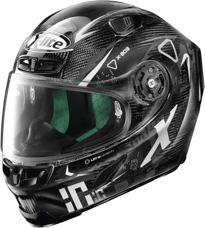 The ultimate race helmet. Ultra-light, full carbon fiber construction features an elegant, race-proven profile for maximum stability at speed. Adjustable rear spoiler ensures stability and strategic venting for massive airflow. Italian design and engineering at its finest.
