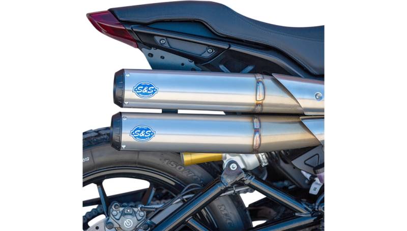 A true race-replica system featuring the same 3.5in. diameter muffler body and end cap design as the FTR750 flat track race bikes