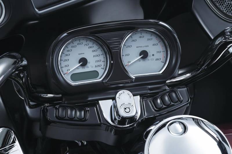 This two-piece accent provides an easy and effective way to instantly customize the speedometer and tachometer cluster for Road Glides.