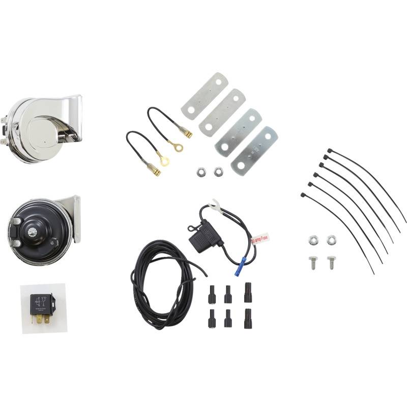 Set includes two horns (one high and one low tone), mounting brackets and installation instructions