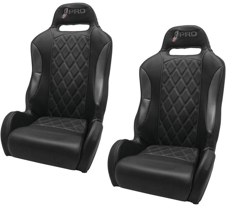 Universal bucket seat designed to fit most UTVs, featuring flatter shoulders and high frameless, no metal side bolsters for increased comfort when entering or exiting the vehicle.