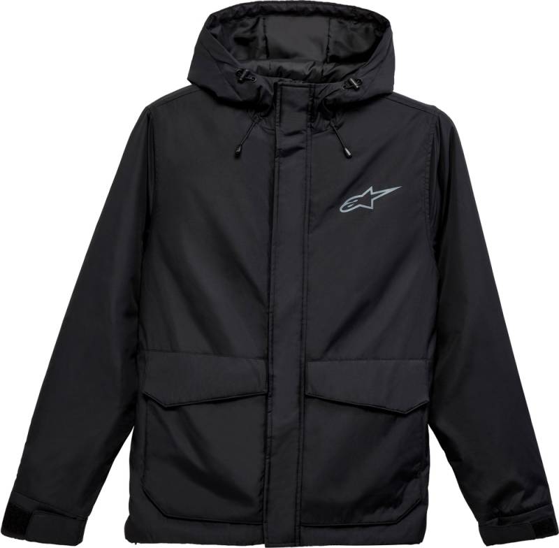 Poly filled hood with bungie adjusters. Front storm flap, inner waist drawcord