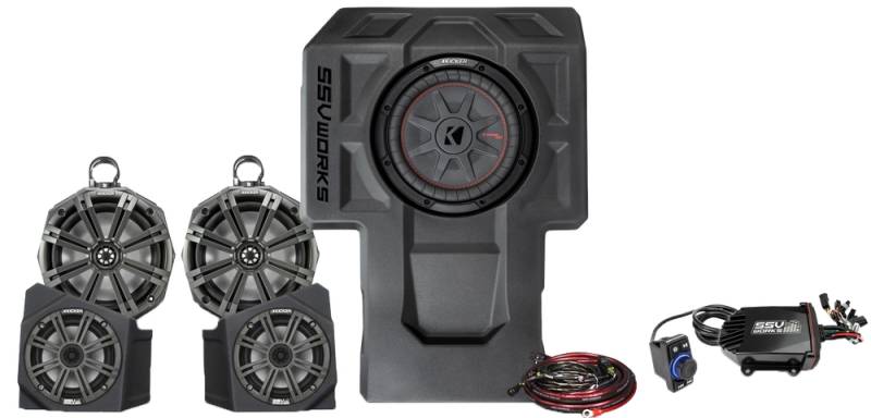 Complete kit ready to install, everything you need to complete the system install including Front Speaker pods with SSV Works marine grade 6.5in. speakers, rear speaker pods with SSV Works marine grade 6.5in. speakers, 10in. marine subwoofer with vehicle specific subwoofer enclosure, Class D 4ch amplifier, amplifier wiring kit and iPod/MP3 input with volume control and 2.1a USB charge