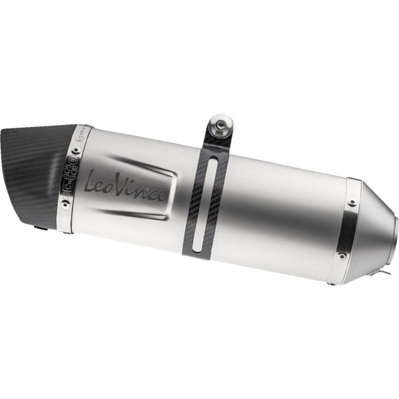 Clean laser-etched LeoVince logo in an innovative carved design (for the carbon fiber exhaust: bright aluminum die-cut high-temp resistant LeoVince adhesive logo)