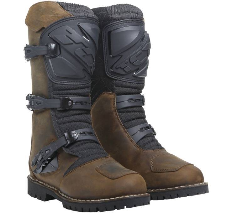 Drifter Waterproof adventure boots, manufactured with the traditional Ideal construction, which features double seam and an intermediate insole to increase sturdiness. Made of full-grain leather with T-DRY waterproof membrane, for use in all conditions, vintage-effect pull-up finish and microfiber inserts. The reinforced polyurethane inserts on the shin, ankle, toe and heel, as well as the protection on the gear area, guarantee maximum safety. In the inner area, the boots are equipped with a suede protection against the heat of the motorcycle. To enhance comfort and flexibility of fit, the boots have been equipped with microfiber front and rear bellows. The closure system consists of three aluminum levers - wear-resistant, interchangeable and ergonomically designed - which facilitate the fastening and unfastening of the boots. The sole with tessellated tread is designed to ensure maximum grip on all surfaces, for use ranging from asphalt to dirt roads. They feature insoles with OrthoLite technology that perfectly cushions all movements and offers high levels of breathability.