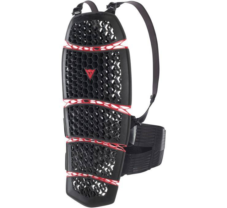 CE -certified Pro Armor, constructed of expanded nitrile rubber with a perforated structure and a functional, anotomical shape. The protector bends and stretches longitudinally and laterally, and it's held in place by removable shoulder straps and a removable, adjustable lumbar band.