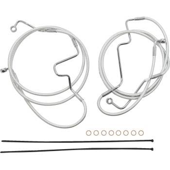 Kits include throttle and idle cables (except 08-15 Dressers), clutch cable or hydraulic clutch line, front brake lines, copper crush washers, hardware and correctly colored wiring extensions with OE-style connectors and shrink tube