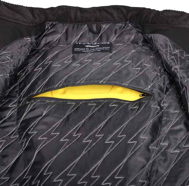 YKK front zipper with embossed button snap wind cover