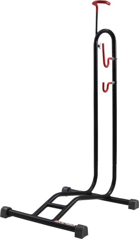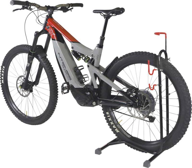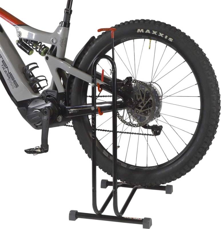 Vertical bike position is space saving,while still providing safety and stability,and allows for maintenance on the front wheel