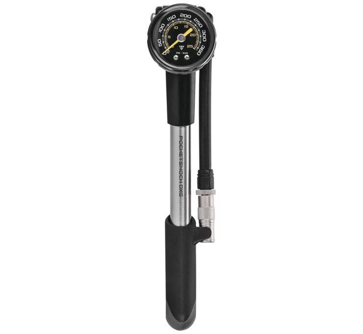 A precision fork and shock pump with an easy-to-read dial gauge for accurate pressure readings up to 360 psi / 24.8 bar.