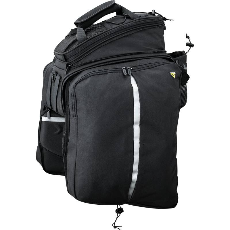 Also features water bottle holder, shoulder strap, carrying handle, elastic top bungees, reflective strip, safety light clip, and optional rain cover