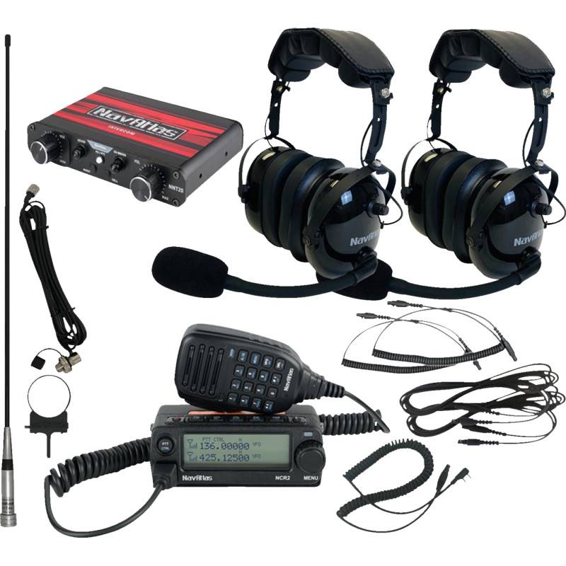 Kit includes: 1 NNT20 Intercom and 1 NCR2 Car-to-Car Radio, 1 Pair NO303 Over-the-Head (Stereo) Headsets, 2 PSC41 (PTT) push-to-talk cables, 2 HCF4 (Front) 4' (EU: 10,16 cm) coil cables connecting the headsets to the HEC10 extension cables, 2 HEC10 (Front) 10' (EU: 25,4 cm) extension cables connecting the intercom to the HCF4 coil cables to headsets and 1 APKG1 Dual Band Antenna with multiple mounting options