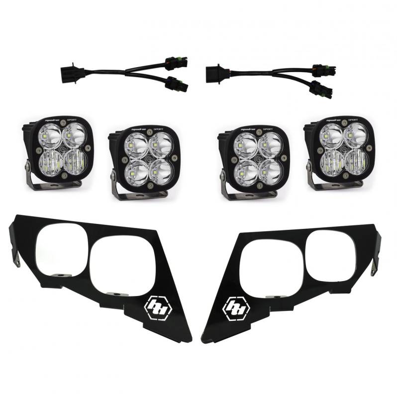 This kit utilizes four Squadron Sports (3150 lumens each). The need for front bumper lighting or roof mounted light bars are a thing of the past. This plug and play mounting kit includes two vehicle specific mounting brackets and a wiring harness, allowing you to use your factory switch and mounting hardware.