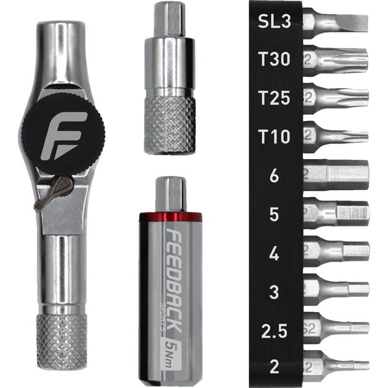 Kit includes ratchet handle, 25 mm extension, 5 Nm click-torque extension, and 10 bits