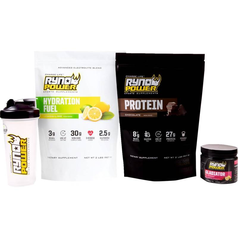 Includes 20 servings of chocolate Protein Premium Whey Powder, fruit punch or lemon lime flavored Hydration Fuel electrolyte drink mix, and 30 servings of strawberry lemonade Gladiator Pre-Workout Boost